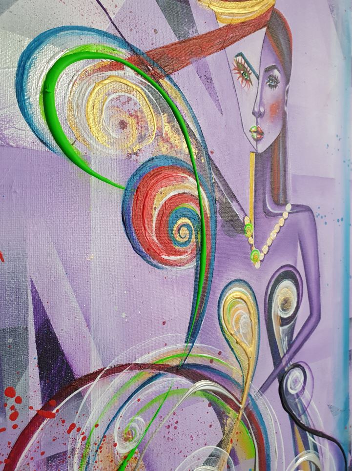 This painting is an abstract piece. It features various shades of purple for the background and numerous abstract shapes. The woman herself is portrayed with two parts of her face, with the left side being highly unrealistic and the right side emitting a somewhat realistic vibe. She wears a tall hat, a large necklace, and a distinctive dress with a bustier. The painting is highly abstract and expressive. For the details, fluorescent paint, thick lines of paint, and paint splatters have been used.