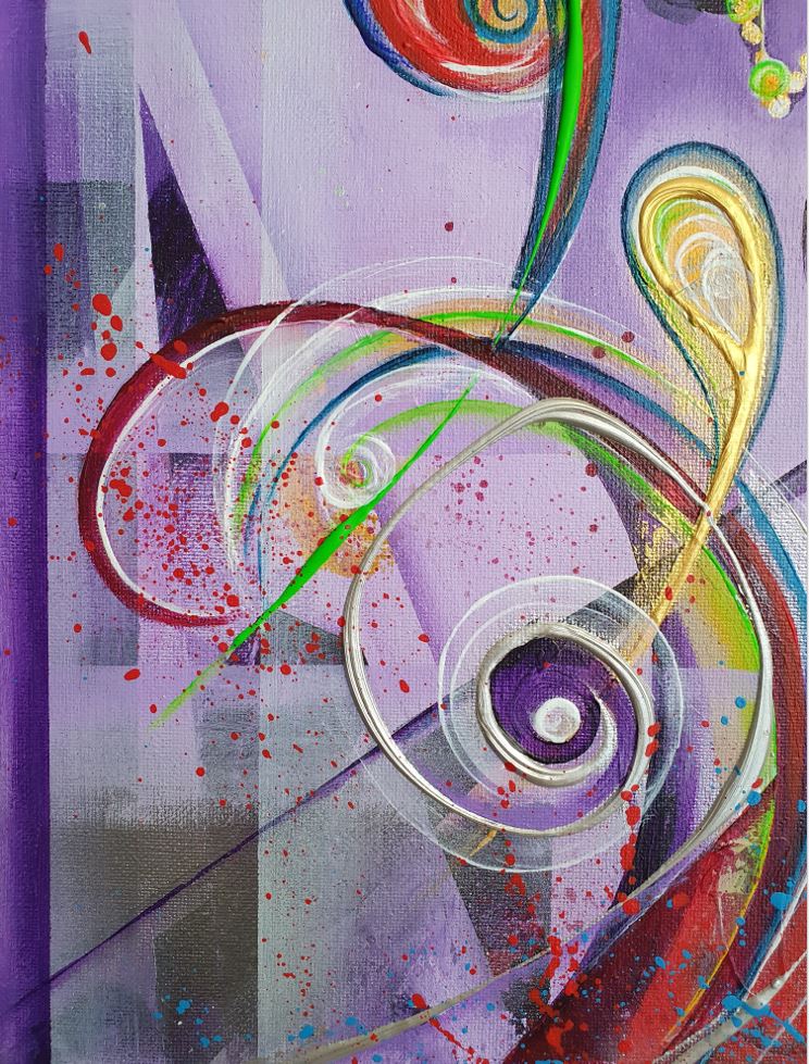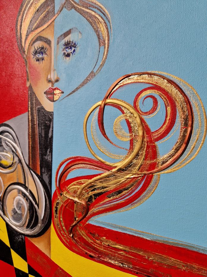 In this painting, you can see a lot of primary colors combined with black and gray. In the middle of the shapes, you can see a woman, and she is listening attentively. The details are created with thick lines of paint and gold leaf. The size of this painting is 40 cm by 50 cm.
