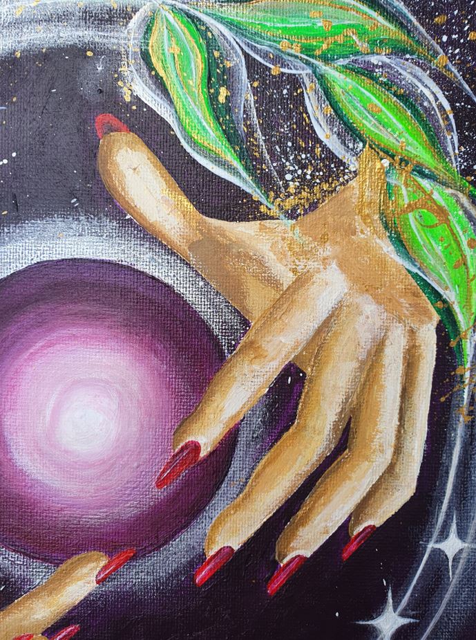 Wich Please is a company that specializes in all things spiritual, ranging from products like incense and tarot cards to spiritual sessions. The company is owned by Maxine, who is also an active blogger. Caroline created a painting based on the logo and the sentiment of Wich Please. You can see the nine leaves from the Wich Please logo in the painting. Magic takes the forefront by making the magical hands the main focus. The background is purple. The color purple represents trusting your own intuition; it is associated with spirituality, meditation, and silence.