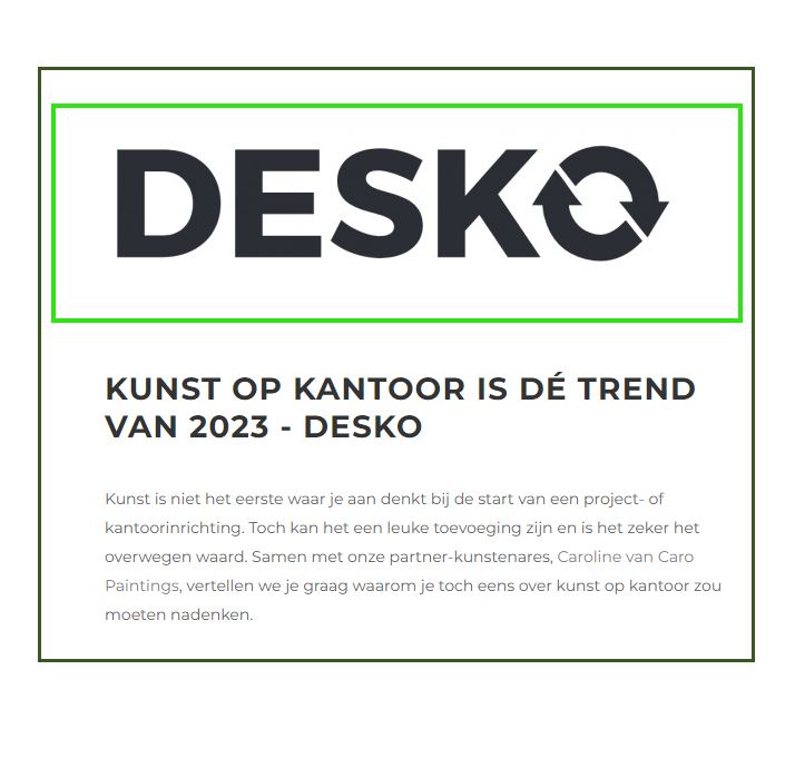 Caroline has previously collaborated with a major office furniture supplier, DESKO, and they have written a blog about the benefits of art in the office. This blog is written in the Dutch language. Double-click the image to read.