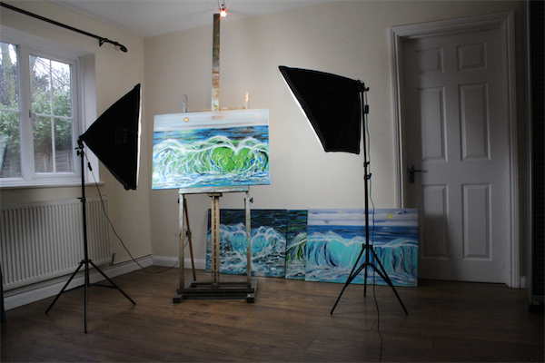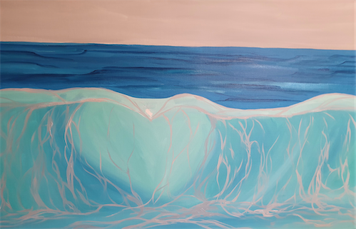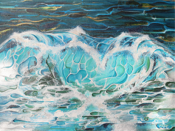 This collection of artworks is called “Oceans Love.” Caroline loves the beach. The wave in the painting is painted in the shape of a heart. That is the central point of the canvas. It is a collection, and at its core, the paintings are the same. However, you can always see a different composition and different colors. Clean lines are visible here and there, just like metallic spray paint. Light is important for a work of art to truly come to life. Especially in these works, light plays a significant role. The colors really shine with proper lighting.