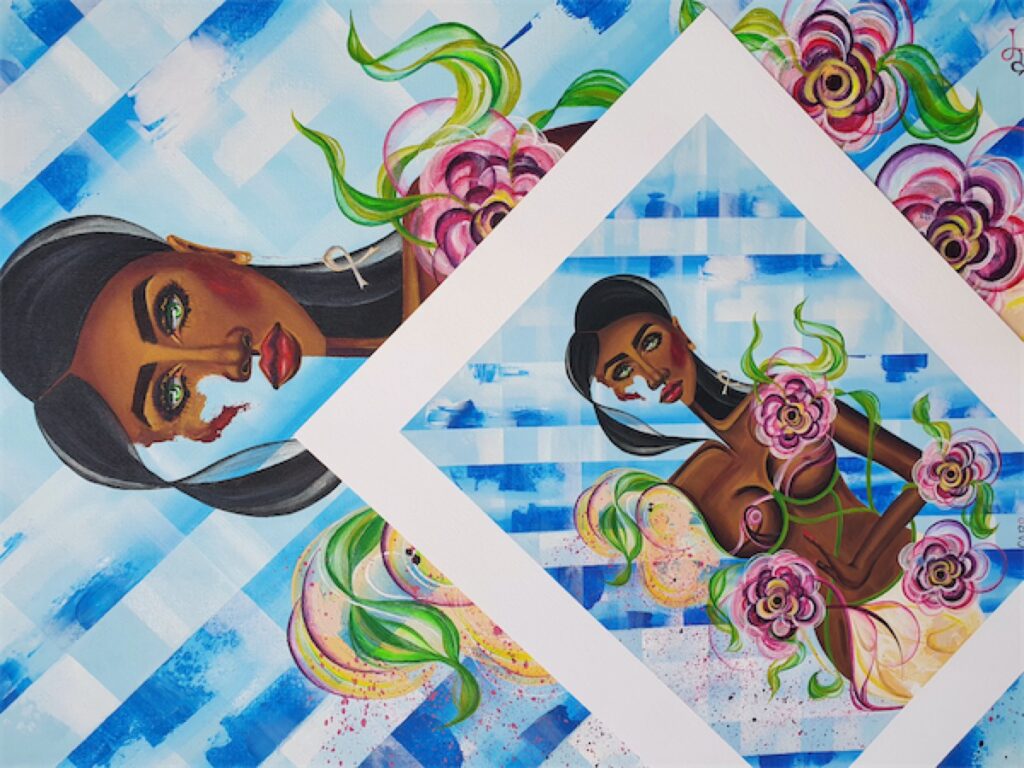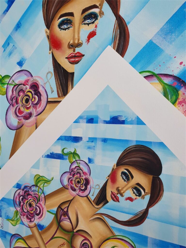 These unique paintings come together as one but can also be displayed as two individuals. Title of the artwork ‘Nora X Sava’. Both paintings were available via auction during October’s Breast Cancer Awareness Month to raise vital funds for those affected by breast cancer. All profits to the Pink Ribbon Foundation.