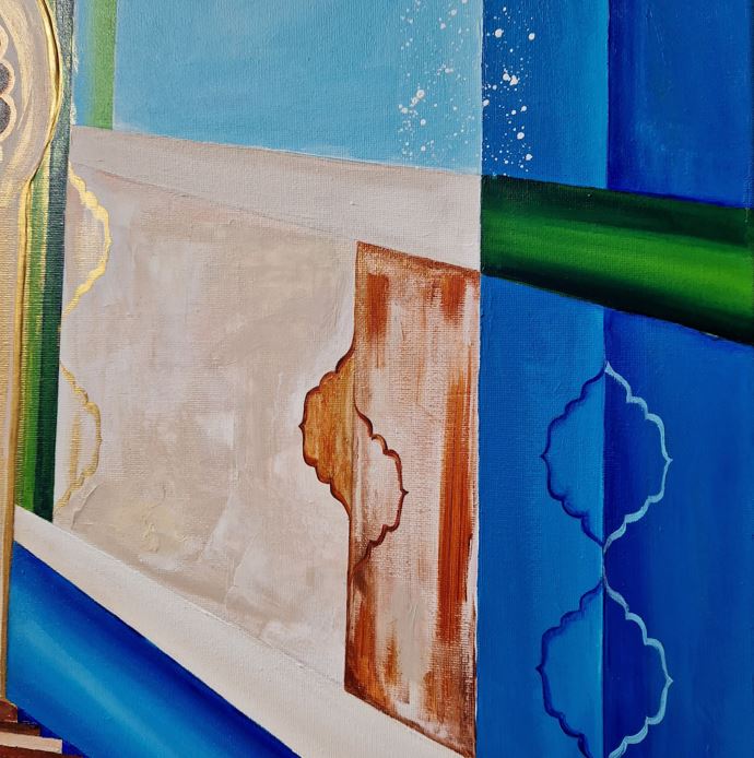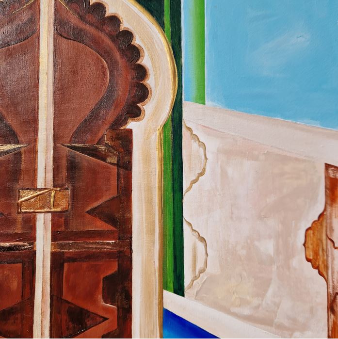 This painting depicts a door in Moroccan style. “When one door closes, another door opens.” “Dare to knock, what’s ‘Beyond’?” The painting features cool colors, with a wooden door as the central element. The Moroccan door is not just a functional object, but also a work of art, rich in symbolism, culture, and history. It carries a deeper meaning that reflects the values of protection, hospitality, and beauty in Moroccan society.